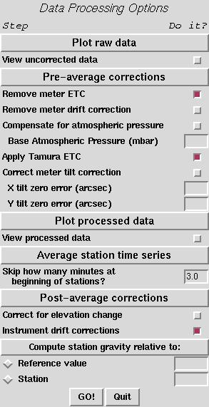 After reading the station parameter file, reduce creates a new window which lists the known stations and their parameters. Note that the program checks to insure that there are parameters for every station in the data file; if not, the program exits. Extra stations in the parameter file are allowed.